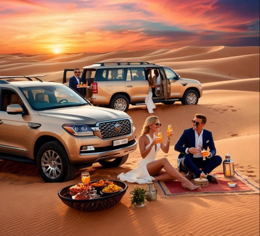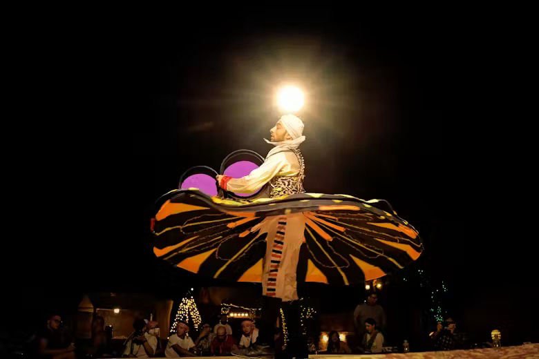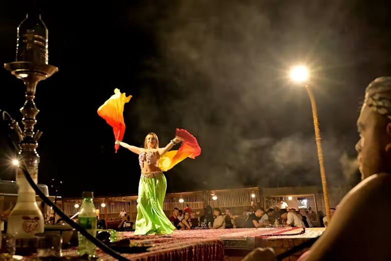 The adventure continues at a traditional Bedouin-style camp. There, guests can interact and capture photos with a majestic falcon, and marvel at mesmerizing belly dances, fire shows, and Tanoura dance performances.