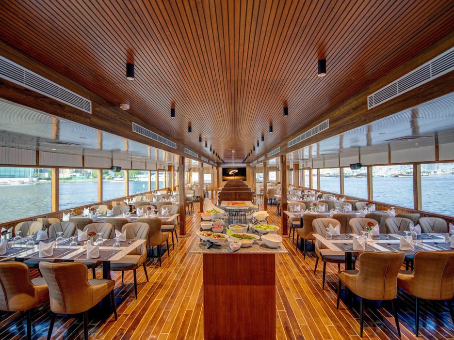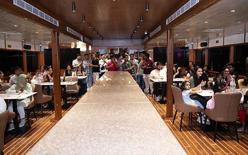 ✔ Luxurious Ambiance – A beautifully designed modern dhow with spacious indoor and outdoor decks, elegant seating, and soft lighting for a magical atmosphere.