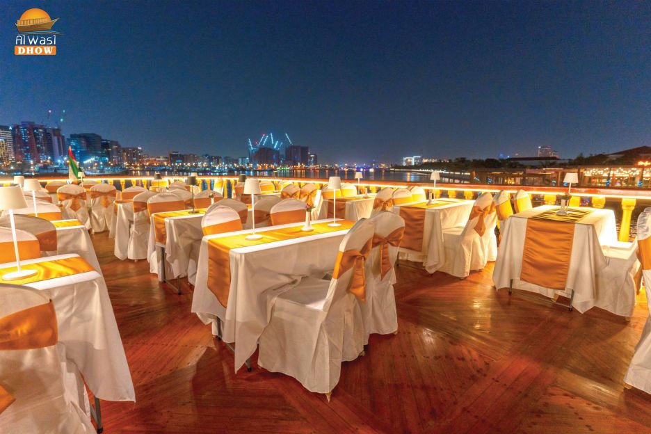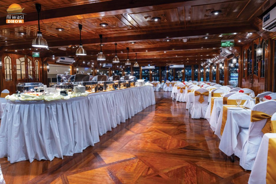 Traditional Wooden Dhow – An authentic Arabian vessel with elegant Arabic décor, open-air & air-conditioned decks.