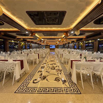 As guests step aboard the Lotus cruise, they are greeted by the vessel's exquisite interiors, featuring modern design elements and luxurious furnishings that evoke a sense of sophistication and style. The ambiance is warm and inviting, setting the stage for an unforgettable evening on the water.