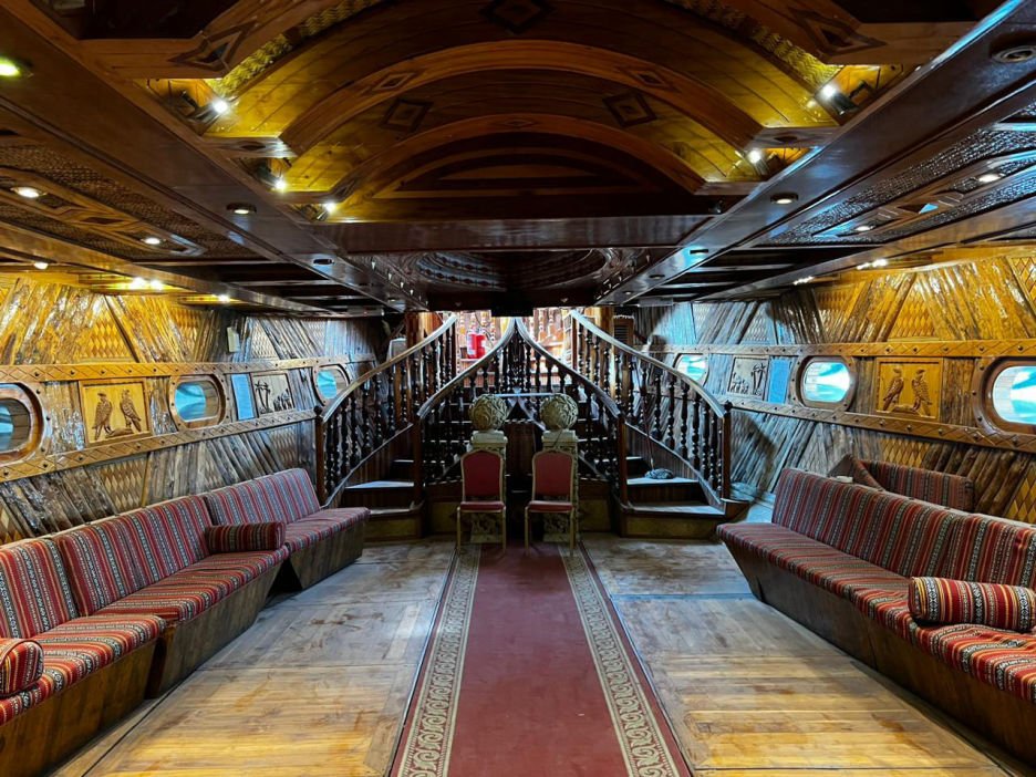 Luxury Traditional Dhow – A beautifully crafted wooden dhow with elegant Arabic décor, spacious seating, and panoramic windows for stunning views.